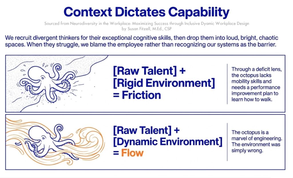 We are essentially pulling an octopus out of the ocean and dropping it onto the beach. On the sand, the octopus looks clumsy. It struggles to move. Through a deficit lens, you might conclude the octopus lacks mobility skills. You might even put it on a performance improvement plan to teach it how to walk. The reality is the octopus is a marvel of engineering. The environment is just wrong. Put it back in the water and watch what it can do.